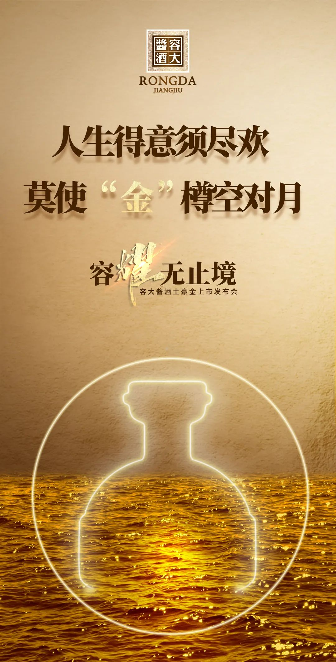 這是容大醬酒的手筆。4月下旬,容大醬酒戰(zhàn)略新品即將上市。樸實(shí)的宣傳語,透露出其口糧醬酒的市場(chǎng)定位;奢華的土豪金顏色,又給人無限遐想,讓人對(duì)其品質(zhì)有了更多期待。