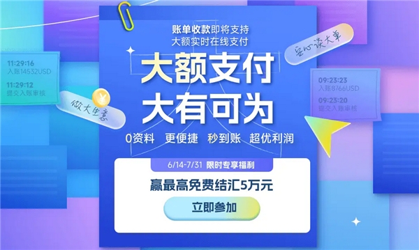 值得一提的是,6月14號至7月31號期間,PingPong福貿(mào)展開限時專享賬單收款福利:最高免費提現(xiàn)5萬額度。用戶成功入賬1次可得免費提現(xiàn)券1萬額度;成功入賬3次可得免費提現(xiàn)券3萬額度;成功收取歐洲、北美買家付款且金額≥$1000,可得免費提現(xiàn)券1萬額度。