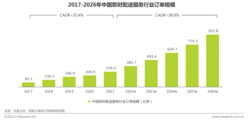 據(jù)艾瑞咨詢《2022年中國即時配送行業(yè)報告》顯示,2021年,即時配送服務行業(yè)訂單規(guī)模為279億單。未來伴隨即時配送服務價值進一步凸顯,預計2026年,即時配送服務行業(yè)訂單規(guī)模將接近千億量級 ,達到957.8億單,2021年-2026年年復合增速為28.0%,行業(yè)整體仍處于快速發(fā)展路線上。