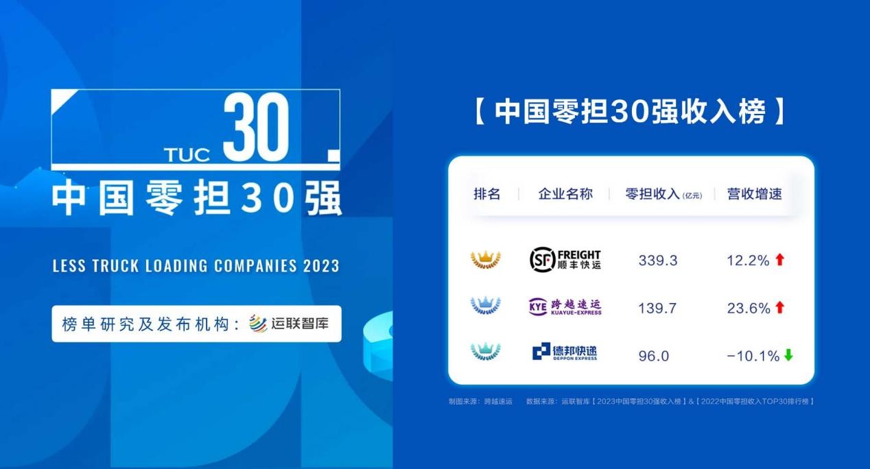 但,過去的16年時(shí)間里,就在大家認(rèn)為快遞領(lǐng)域的競(jìng)爭(zhēng)進(jìn)入白熱化階段的時(shí)候,跨越卻加速崛起“后來居上”。8月9日,運(yùn)聯(lián)智庫頒布2023中國零擔(dān)排行榜,跨越以139.7億總營收蟬聯(lián)榜單第二名(第一是順豐,第三是德邦),營收增速逆勢(shì)提升到23.6%,領(lǐng)跑榜單三甲企業(yè)(順豐12.2%,德邦-10.1%)。