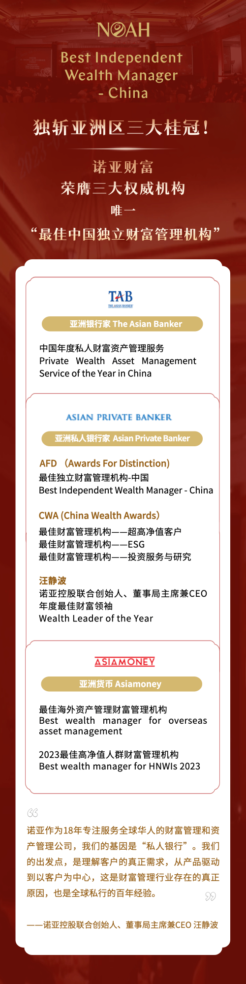 3月27日,諾亞財富在第五屆《亞洲私人銀行家》(Asian Private Banker)中國財富獎(China Wealth Awards)評選中斬獲四大榮譽(yù)的優(yōu)異成績,在“超高凈值客戶”、“ESG”、“投資服務(wù)與研究”和“年度最佳財富領(lǐng)袖”個人成就獲得權(quán)威認(rèn)可。在此前的3月8日,諾亞亦作為中國區(qū)唯一獲獎財富管理公司榮獲《亞洲私人銀行家》亞洲區(qū)“2022中國最佳獨(dú)立財富管理機(jī)構(gòu)”,受邀與法國巴黎銀行、摩根私人銀行、匯豐銀行、花旗銀行、瑞士信貸銀行、澳大利亞國民銀行、國泰世華等國際私人銀行及財富管理標(biāo)桿一同出席于中國香港舉辦的盛典,也是諾亞財富第六年獲得亞洲私人銀行家的多項認(rèn)可。