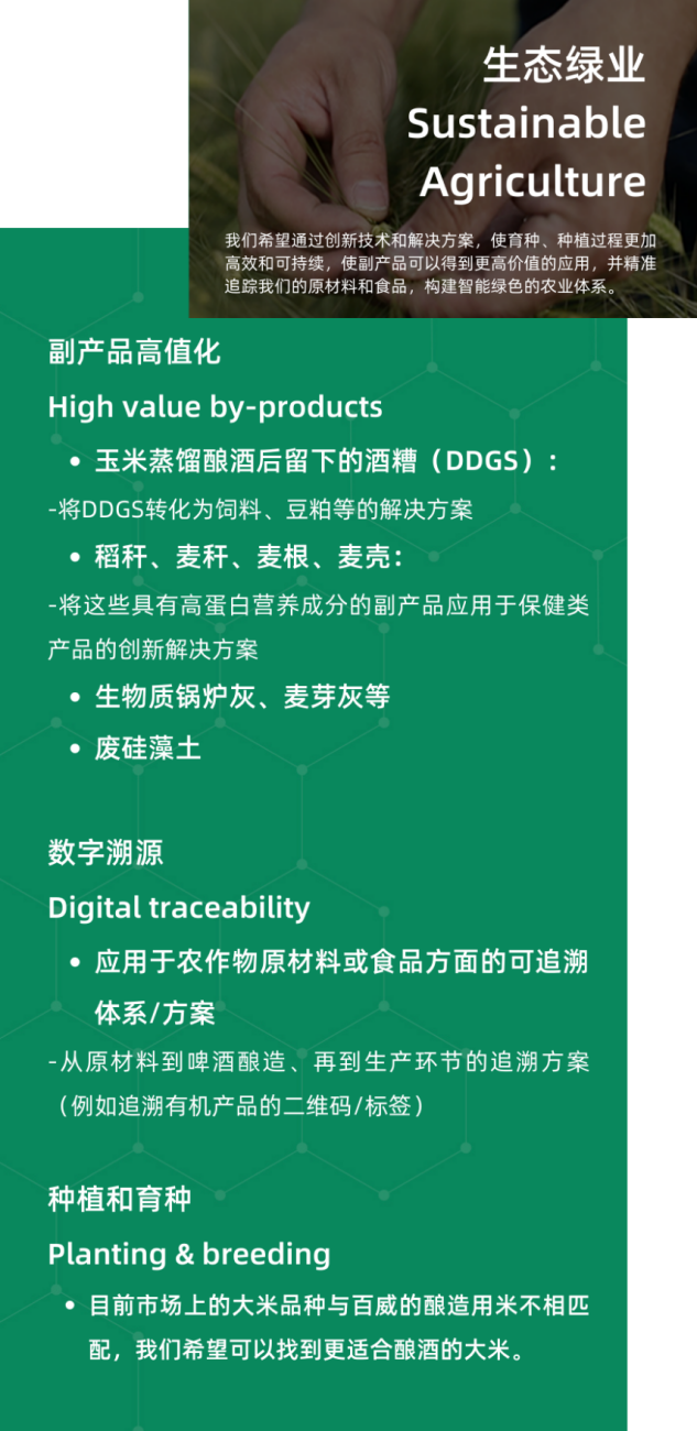 每一年,100+創(chuàng)新中心都會在價值鏈上梳理亟待解決的可持續(xù)發(fā)展挑戰(zhàn)議題并公開招募創(chuàng)新解決方案,目標是讓你的想法得到驗證并實現(xiàn)商業(yè)化應(yīng)用,在試點完成后能夠獲得更大的商業(yè)合同,與百威中國以及更多伙伴建立強有力的合作。