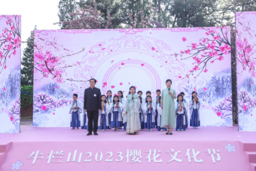 開幕式在孩子們的朗朗讀書聲中緩緩拉開,一群少年身著漢服在朝陽中誦讀《少年中國說》、《水調歌頭》。牛欄山地區(qū)黨委書記姜惠琴在致辭時表示:“以櫻花為媒,舉辦此次櫻花節(jié)活動,以沉浸式場景演出,融入全民閱讀,文明創(chuàng)城等活動,相信能夠給大家?guī)硪粓鑫幕⒀?#xff0c;也將為順義區(qū)打造一個更加亮麗、持久的文化旅游城市名片?!?月23日,將迎來第28個世界讀書日。牛欄山作為全國文明鎮(zhèn),姜惠琴在此倡導大家多讀書,讀好書,以書為媒,為文明創(chuàng)城創(chuàng)建賦能添彩,讓全民閱讀之氣彌漫,讓文明在全社會蔚然成風。
