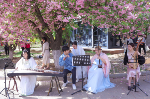 賞櫻線路上,櫻花大道內一群青年大學生身懷技藝,各式才藝展演,民樂、古箏獨奏、管弦、鋼琴獨奏、快閃《愛出發(fā)》《花?!贰肚啻壕毩晝浴贰恫坏貌粣邸贰逗髸o期》街舞、中國舞、樂隊青春活力,青年大學生校園科技文化展示區(qū)機器人展示、大賽作品及藏品展、模型沙盤互動、環(huán)保、創(chuàng)城互動區(qū)地球日主題、綠色農業(yè)創(chuàng)城理念、經濟普法知識互動,展示了當代大學生的蓬勃的創(chuàng)新精神和社會責任感。