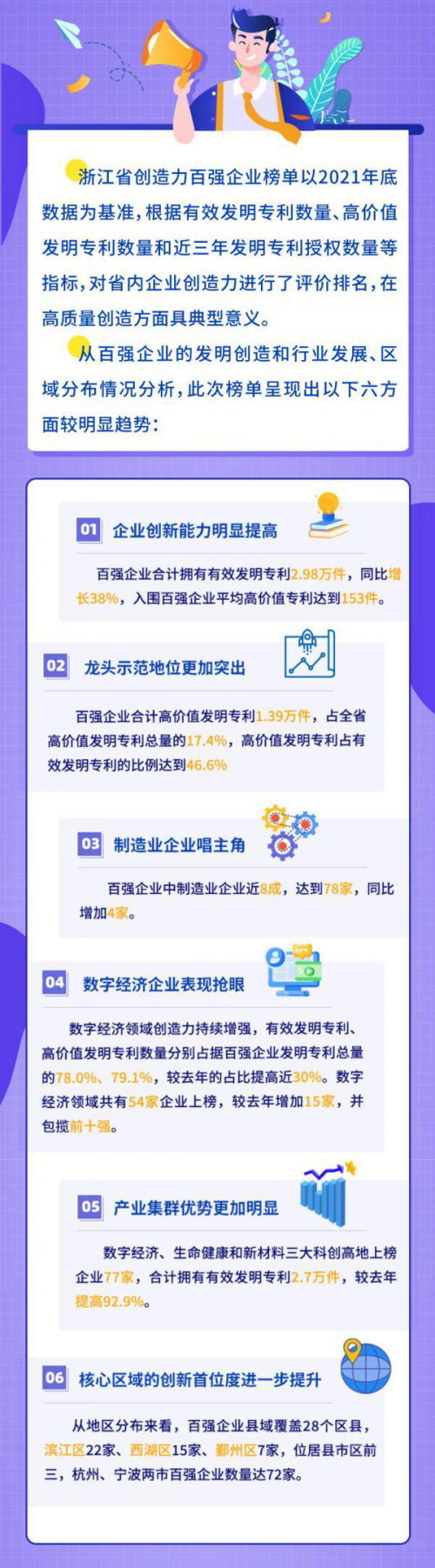 “百強企業(yè)合計擁有有效發(fā)明專利2.98萬件,同比增長38%。入圍百強企業(yè)平均高價值專利達到153件,合計高價值發(fā)明專利共1.39萬件,占全省高價值發(fā)明專利總量的17.4%。”浙江省市場監(jiān)管局相關(guān)負責(zé)人表示。