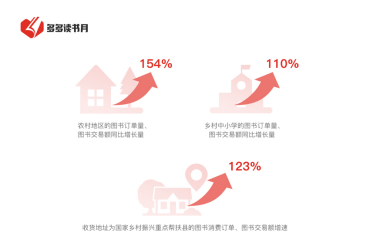 自2014年起,“全民閱讀”連續(xù)9次被寫入政府工作報(bào)告。據(jù)拼多多此前發(fā)布的《2021多多閱讀報(bào)告》調(diào)查數(shù)據(jù),在第一、第二季“多多讀書月”活動(dòng)期間,來自農(nóng)村地區(qū)的圖書訂單量、圖書交易額同比增長(zhǎng)超過154%,來自鄉(xiāng)村中小學(xué)的圖書訂單量、圖書交易額同比增長(zhǎng)超過110%。