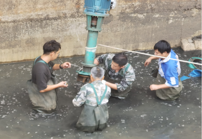 工人們在污水池清污