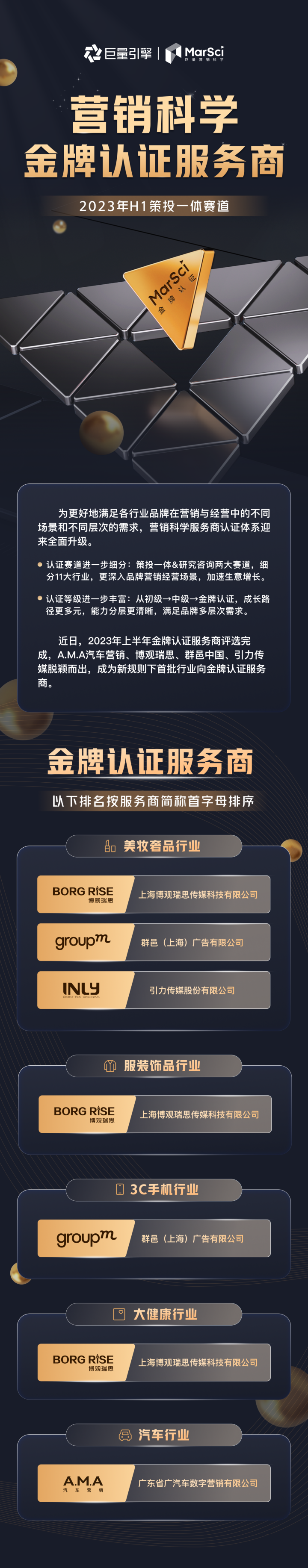 在新認證規(guī)則下,經(jīng)過多輪的篩選和答辯,2023年H1“策投一體賽道”金牌認證服務商評選于近日圓滿結(jié)束,A.M.A汽車營銷、博觀瑞思、群邑中國、引力傳媒四家優(yōu)秀的服務商伙伴脫穎而出,成為首批行業(yè)向金牌認證服務商。