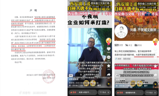 2023年3月16日,大唐不夜城官方率先在抖音、曲江文旅、大唐不夜城、曲江文化、微博、西安大唐不夜城等平臺(tái)官方認(rèn)證賬號(hào)上全網(wǎng)發(fā)布聲明,該聲明指出:發(fā)現(xiàn)網(wǎng)絡(luò)流傳的“西安“錦上添花”就是西安大唐不夜城的打造者”及“該集團(tuán)董事長(zhǎng)劉磊為大唐不夜城項(xiàng)目策劃師”等不實(shí)消息,是假冒大唐不夜城品牌“該集團(tuán)及其相關(guān)人員打著該旗號(hào)欲與多家單位達(dá)成合作,該集團(tuán)及其相關(guān)人員虛假宣傳行為給我司已造成嚴(yán)重不良的社會(huì)影響?!?/p>