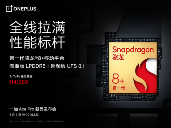 一加 Ace Pro搭載第一代驍龍?8+移動(dòng)平臺(tái),驍龍8+采用全球領(lǐng)先的臺(tái)積電4nm制程工藝,相較上一代CPU和 GPU性能提升10%,同時(shí)功耗降低30%,能效比得到顯著提升。驍龍8+搭載第7代高通 AI引擎,AI能效提升20%,釋放更強(qiáng)勁的AI處理能力。一加 Ace Pro還搭載滿(mǎn)血版LPDDR5、超頻版UFS3.1,與驍龍8+協(xié)同帶來(lái)更流暢的使用體驗(yàn)。憑借強(qiáng)悍的性能表現(xiàn),一加 Ace Pro在跑分軟件AnTuTu上跑出了1141383的高分。