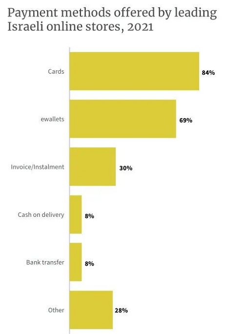 以色列主要的支付方式包括Visa、MasterCard,Isracard(以色列本土支付方式),Paypal、Other Wallets和American Express。卡支付在以色列非常流行,TOP100的零售商中,84%提供信用卡支付,69%提供電子錢包支付,Visa和萬事達信用卡是當(dāng)?shù)刈钍軞g迎的付款方式。