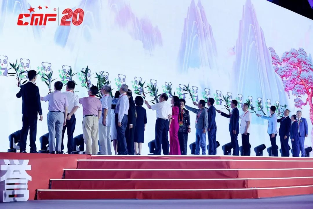 20位貴賓每人手拿一個(gè)象征四季常青,頑強(qiáng)生命、節(jié)節(jié)高升的竹子,“喂”向屏幕上的國寶“小小”大熊貓,當(dāng)國寶得到了“食物”的給養(yǎng),茁壯成長,20個(gè)“小小”大熊貓匯聚成一個(gè)巨大的有知識、有力量、有擔(dān)當(dāng)?shù)拇笮茇垺?/p>